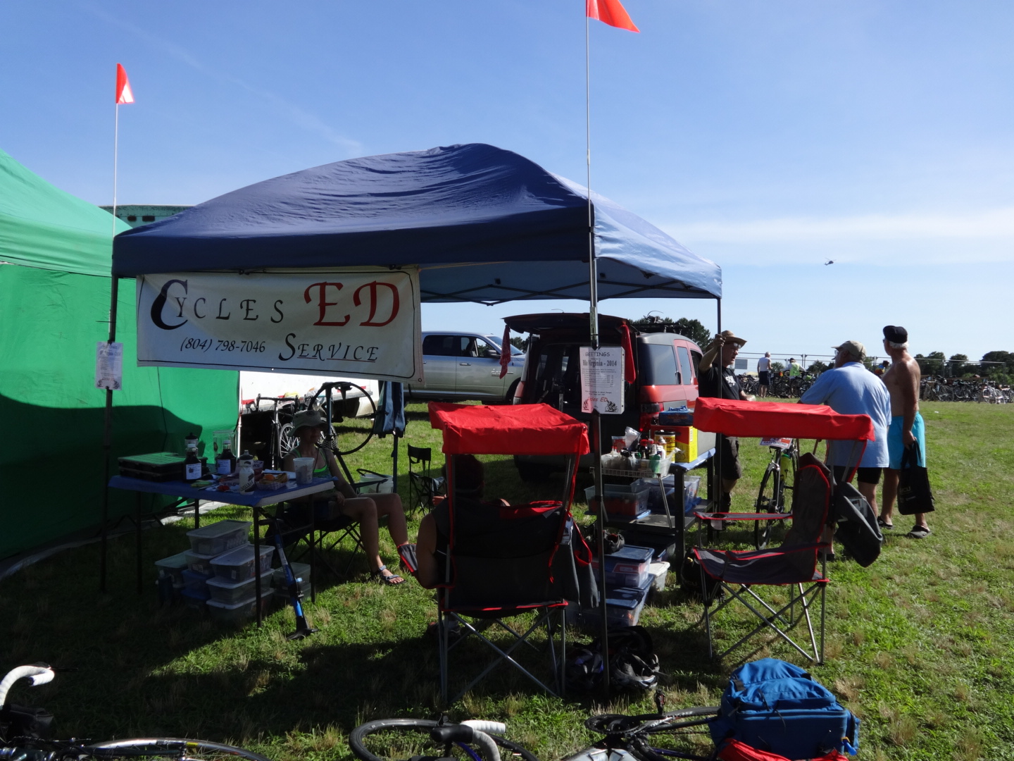 So while Ed of Cycles by ED played with the derailleur, we were offered “thrones” to sit in – wonderfully awesome folding canvas chairs – the kind I never totally appreciated as a soccer mom, but I certainly appreciated today! And we got talking to Andy, a lady on the ride who was hanging out with Ed. And then Andy and Jody went to help David set up the beer tent, and I offered to help.
