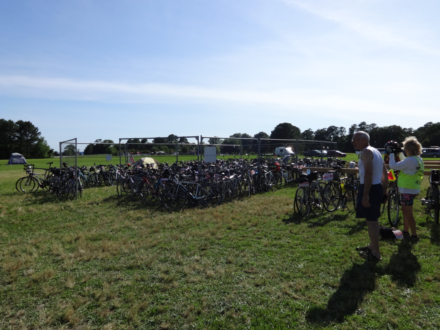 Then we came to Chickahominy Park, where the Bike Virginia people had set up their tent city for tonight. So we figured we would go use their bathrooms, and take some pictures of what 2000 bikes look like stacked around 1000 tents.