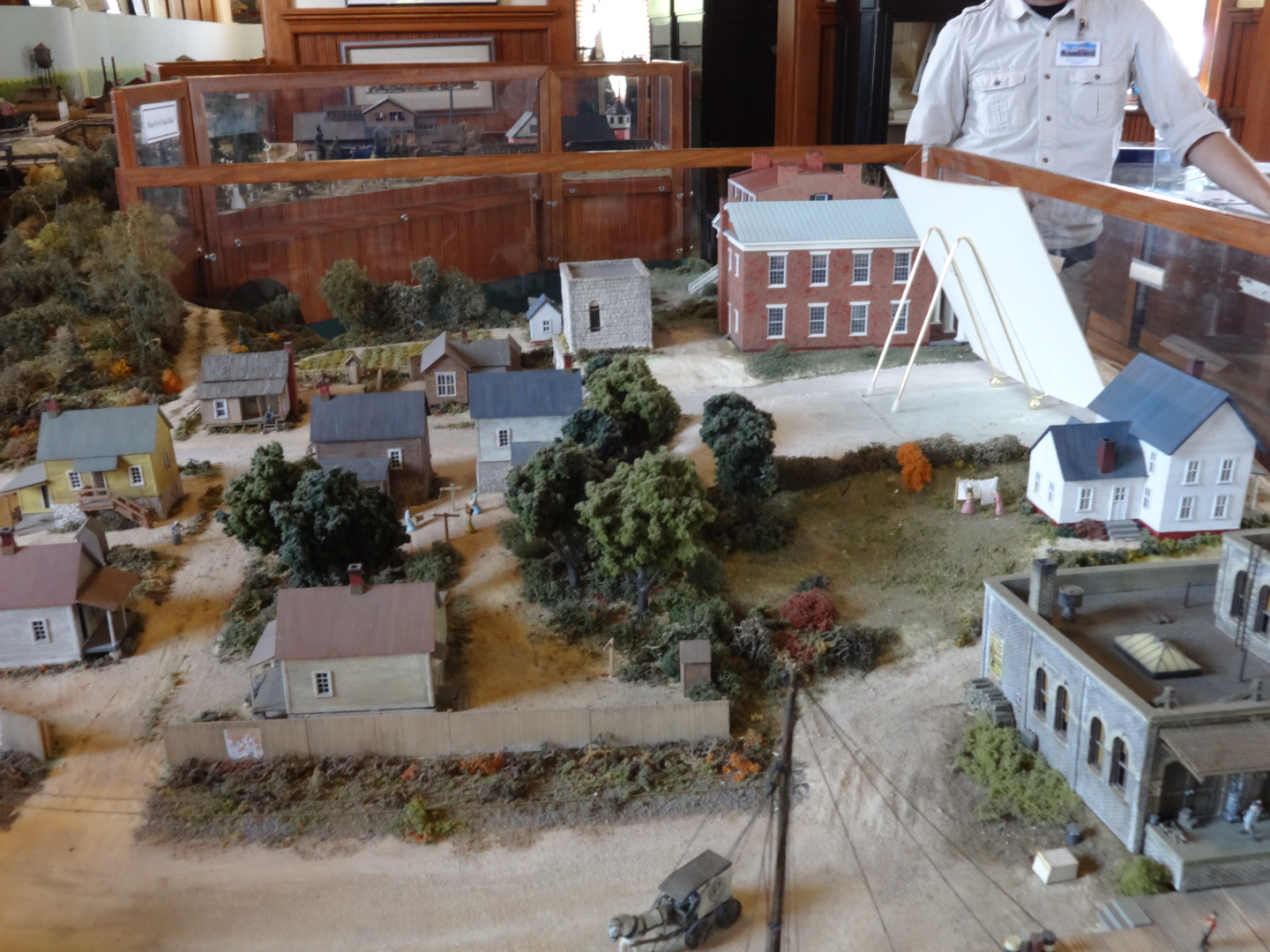 Then we walked about a quarter mile to downtown Suffolk, at which point we were very hot and surprisingly exhausted, so we turned around. On our way back we stopped at the Suffolk Seaboard Airline Station Railroad Museum. It is in an old passenger station that was closed in 1965, and it is filled train memorabilia. There’s an H-O model train running through it, with a miniature of Suffolk, including Riddick’s Folly. I took a picture because a model train is sort of a diorama with a train running through it, right?