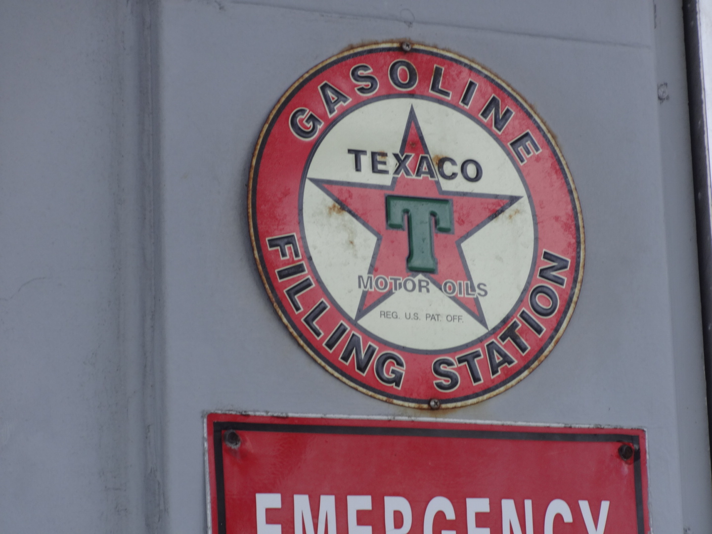 The problem with the pretty roads in the rich towns was that there were no convenience stores. so we stopped at a lemonade stand and bought drinks from kids. Then one mile later – of course – we found a gas station. It had a cool old Texaco sign