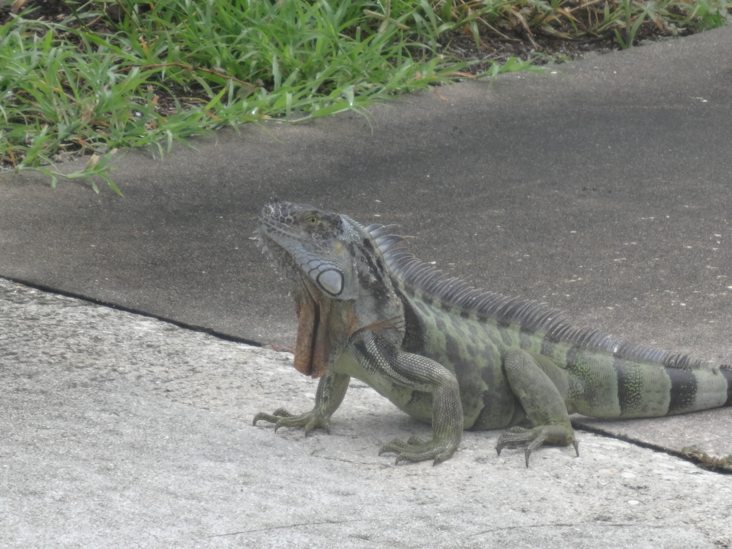 We were still soaking wet, with water sloshing in our shoes, mud running down our backs, grit everywhere. Our brakes were making funny noises and didn’t work very well. Then we had to go off route to get around the airport, and the route Google Maps sent us on went through about 6 miles of highways and industrial roads and generally nasty, scary, ugly ickiness. But just as we got out of the ickiness, just before yet another draw bridge, we saw this amazing, huge lizard – he was almost two feet long!
